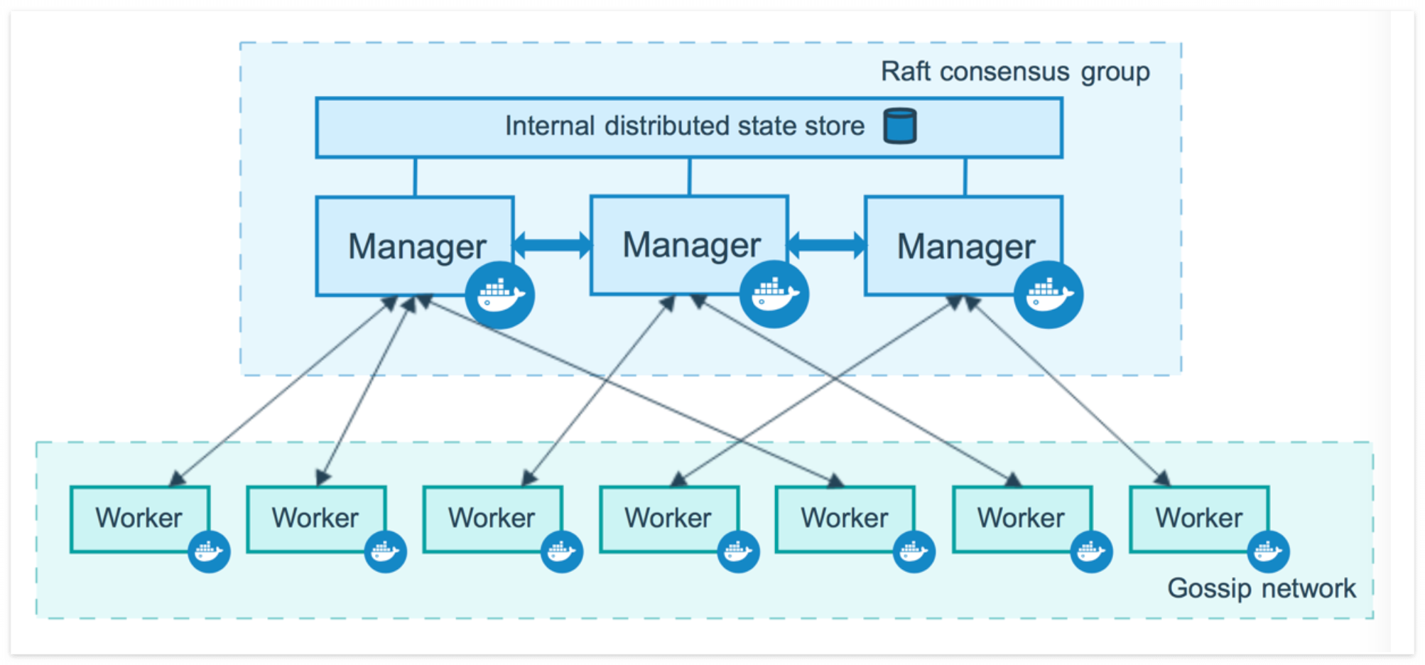 Raft 를 사용하여 전체 스웜과 스웜에서 실행되는 모든 서비스의 일관된 상태를 유지한다.